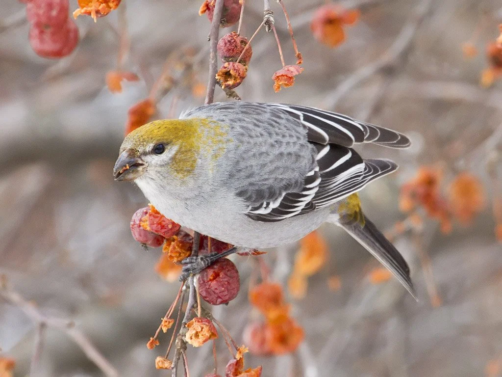 Pine Grosbeaks are a vibrant songbird that resides in the finch family. The males of this species captivate with their dazzling plumage, ranging from bright pink to radiant rose-red. Meanwhile, the females and juveniles boast a more subtle beauty, adorning olive-yellow feathers with delicate dusky streaks. Both males and females proudly display their heavy, conical bills, earning them their distinctive name "grosbeak," which translates to "large beak." Listen to Pine Grosbeak birdcall here.