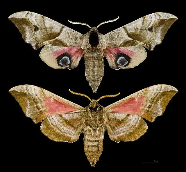Image of a Hawk Moth, similar to the One-Eyed Sphinx whose eye pattern is located on a smaller hindwing. (Source: Wikimedia Commons, Didier Descouens)